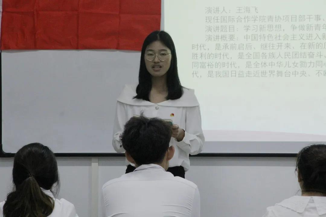 王海飞同学以“学习新思想,争做新青年”为题展开宣讲。中国特色社会主义进入新时代,是我国发展新的历史方位。这个新时代,是承前启后、继往开来、在新的历史条件下继续夺取中国特色社会主义伟大胜利的时代,是全国各族人民团结奋斗、不断创造美好生活、逐步实现全体人民共同富裕的时代,是全体中华儿女勠力同心、奋力实现中华民族伟大复兴中国梦的时代,是我国日益走近世界舞台中央、不断为人类作出更大贡献的时代。
