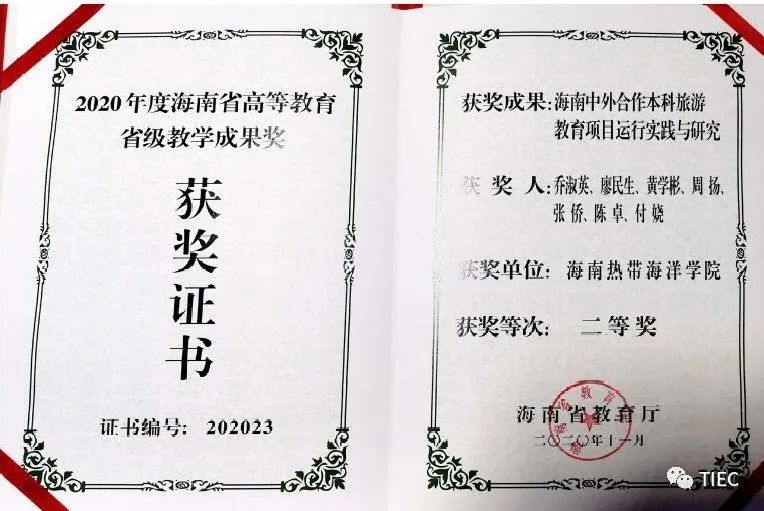 公司旅游公司中奥项目教学部研究团队在乔淑英、廖民生、黄学彬、周扬等老师带领下以《海南中外合作本科旅游教育项目运行实践与研究》项目荣获海南省高等教育省级教学成果二等奖。