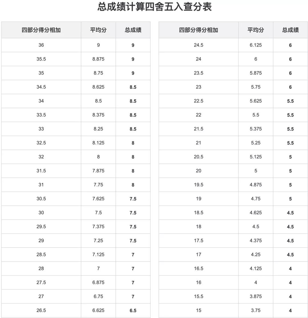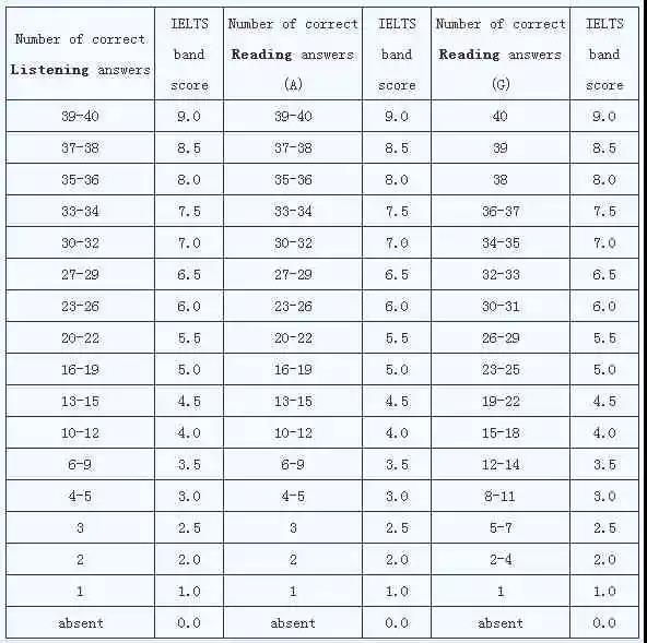 雅思考试听力阅读评分标准(表格对照表)