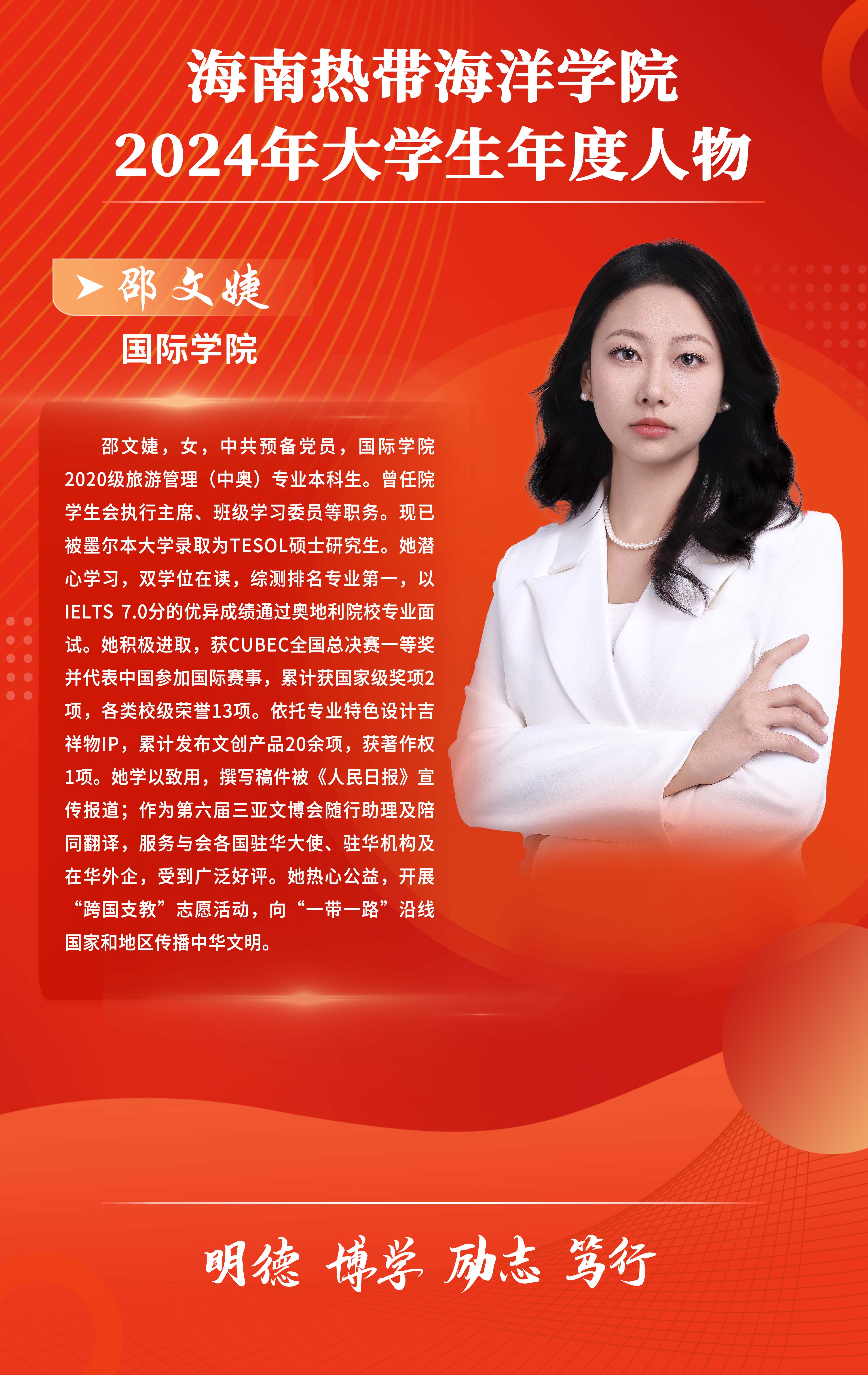 邵文婕,中共预备党员,系2020级旅游管理(中外合作办学)专业员工,被评选为伟德bv1946官网2024年老员工年度人物。