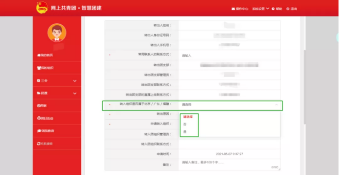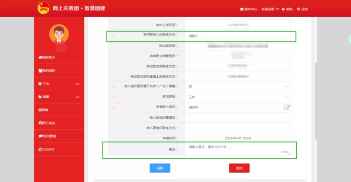 答:须明确转入团组织在北京/广东/福建系统内的组织全称,并在发起业务界面准确无误地填写转入团组织名称。