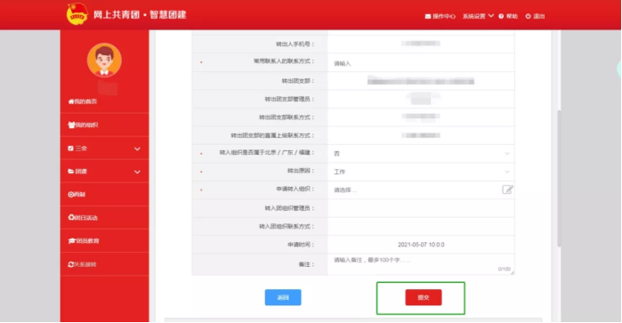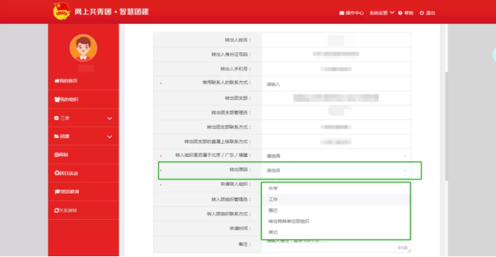(三)填写剩余的信息、选择你要“申请转入组织”(进行系统操作前,请务必确认、联系好自己的“拟转出组织全称”(附后),再进行操作。国内升学的同学转入升学公司;工作的同学可转入单位或公司团支部,若单位或公司没有团支部可转接至工作单位所在地的乡镇街道团组织;待业的同学可转回户籍地。)。