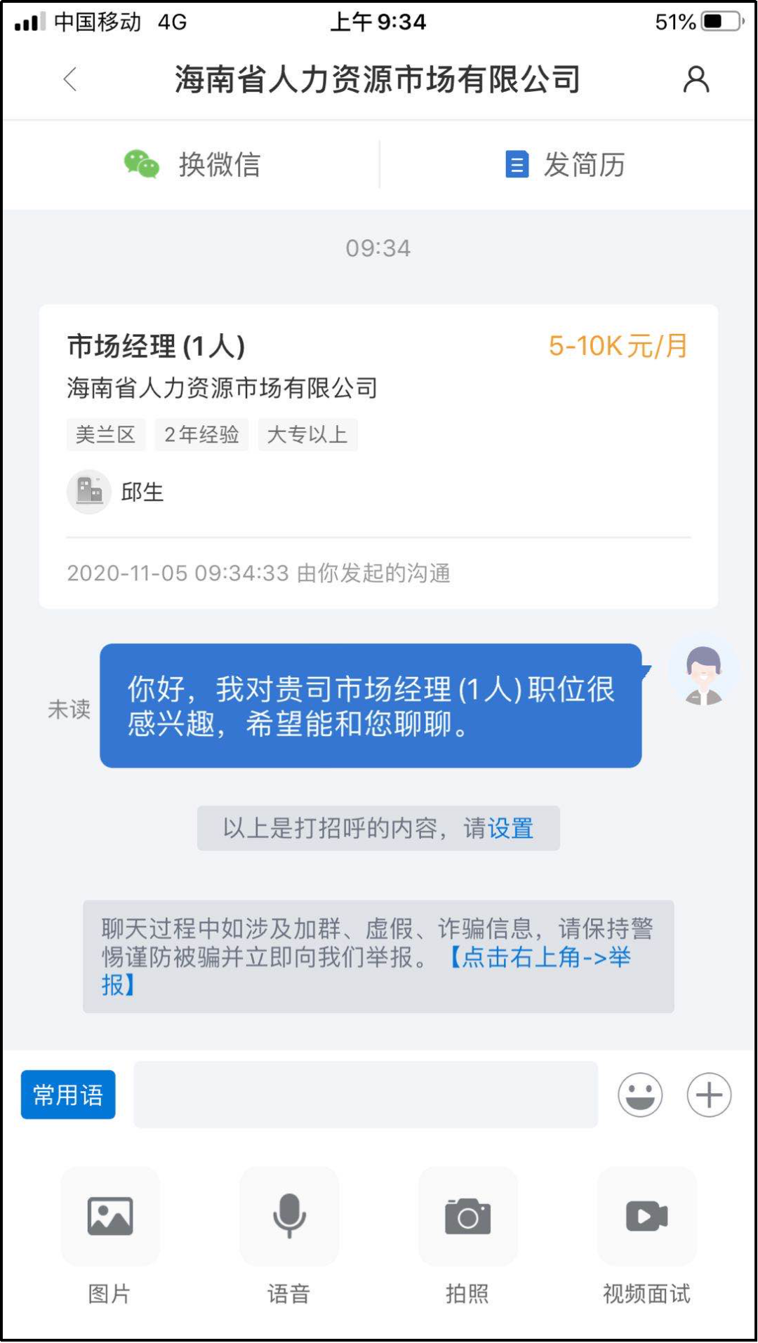 3、简历注册成功后,可在页面浏览搜索心仪岗位,选择左下角和TA聊聊,选择视频面试。